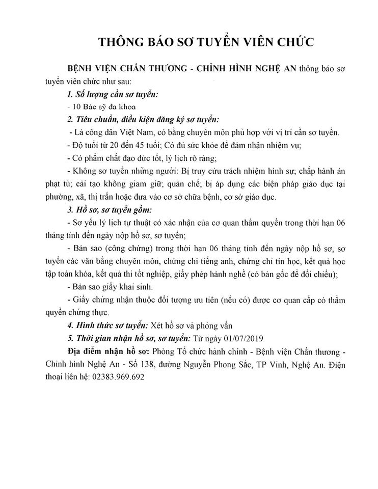 Bệnh viện Chấn thương Chỉnh hình Nghệ An: Thông báo Tuyển Dụng