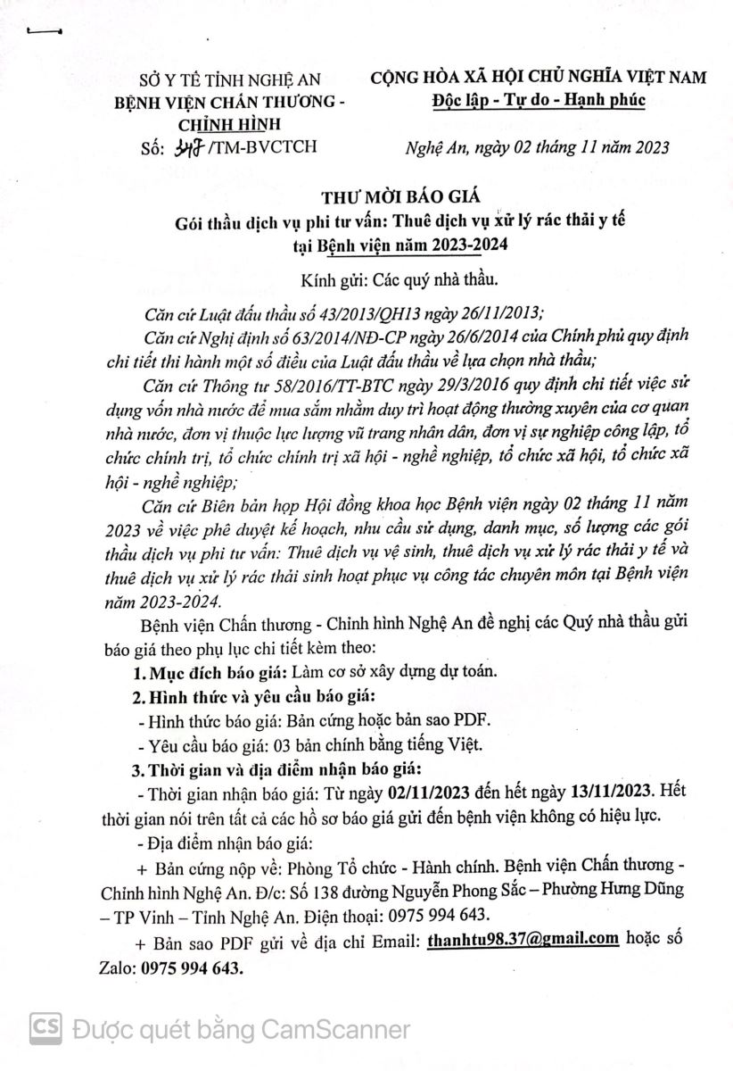 Bệnh viện Chấn thương - Chỉnh hình Nghệ An thông báo mời báo giá gói thầu dịch vụ xử lý rác thải y tế tại Bệnh viện năm 2023-2024 như sau: